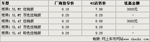 據(jù)長安鈴木4S店銷售人員介紹,雨燕目前現(xiàn)車并不多,炫銳版手動擋和自動擋兩款車型目前只能優(yōu)惠3000元。以外,還有手動雙色炫銳版,目前只有極少現(xiàn)車,并且沒有任何優(yōu)惠。而自動雙色炫銳版和粉色炫銳版目前都沒有現(xiàn)車,預(yù)訂需要等15天左右。