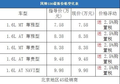 東風(fēng)風(fēng)神S30上市后,價(jià)格一直都比較穩(wěn)定,和競(jìng)爭(zhēng)對(duì)手相比,風(fēng)神S30的價(jià)格優(yōu)勢(shì)并不是非常突出,因此市場(chǎng)表現(xiàn)也只能用一般來(lái)形容,其12月份不足5000輛的月銷(xiāo)量也從側(cè)面反映了這個(gè)問(wèn)題。我們近日從北京地區(qū)的一家東風(fēng)風(fēng)神汽車(chē)4S經(jīng)銷(xiāo)商處了解到,目前該店正在舉行購(gòu)車(chē)送2.5%購(gòu)置稅的活動(dòng),相當(dāng)于有1500元以上的現(xiàn)金優(yōu)惠。以下是風(fēng)神S30全系車(chē)型最新報(bào)價(jià)表: