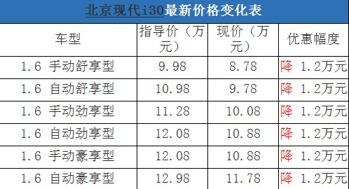 近日,編輯從北京地區(qū)北京現(xiàn)代4S經(jīng)銷商處了解到,現(xiàn)代i30有較為充足的現(xiàn)車銷售(紅色、銀色和灰色),可以滿足消費者在春節(jié)前夕的購車需求。目前在4S店中購車可獲贈價值1萬元的裝潢禮包,經(jīng)銷商表示這個優(yōu)惠可以折現(xiàn),但具體金額需要消費者到店詳談才能確定。相比之下,現(xiàn)代i30在綜合經(jīng)銷商處的優(yōu)惠幅度更加可觀,1.6L車型可以優(yōu)惠現(xiàn)金1.2萬元。以下是現(xiàn)代i30最新價格變化表: