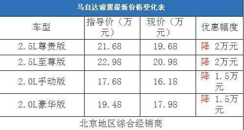 近日,編輯從北京地區(qū)一汽馬自達(dá)4S經(jīng)銷商處了解到,睿翼的2.0L車型和2.5L車型都有現(xiàn)車在售,2.5L車型在4S店的優(yōu)惠為8000元,而上市不久的2.0L車型只有禮包贈(zèng)送。相比之下,綜合經(jīng)銷商處的馬自達(dá)睿翼優(yōu)惠幅度非常大,2.5L車型已經(jīng)跌破了20萬元,2.0L車型也有了1.5萬元的現(xiàn)金優(yōu)惠。以下是馬自達(dá)睿翼最新價(jià)格變化表: