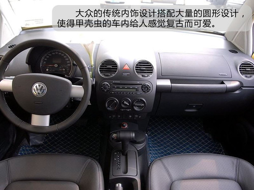 甲殼蟲(chóng)的內(nèi)飾具有很明顯的大眾特征,各種開(kāi)關(guān)、按鍵對(duì)于經(jīng)常駕駛大眾車輛的人來(lái)說(shuō)是十分熟悉的。最特別的就是圓桶形的大儀表,速度表最大,幾乎占據(jù)了整個(gè)儀表盤(pán)面,中部是行車電腦,置于下方的是油表和轉(zhuǎn)速表。