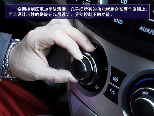 空調(diào)控制區(qū)就更加簡潔了,幾乎把所有的功能就集合在兩個(gè)旋鈕上,而且設(shè)計(jì)巧妙的是旋鈕雙層設(shè)計(jì),分別控制不同功能。但在使用時(shí)我們發(fā)現(xiàn)旋鈕的指示標(biāo)是一個(gè)小的凹槽,在光線不足是可以看到是一個(gè)小燈,但在白天時(shí)這個(gè)凹槽并不十分明顯,可能會造成讀取的小障礙。