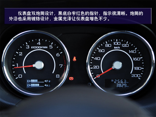 儀表盤雙炮筒設(shè)計(jì)與運(yùn)動風(fēng)格相統(tǒng)一,黑底白字紅色的指針,指示很清晰。炮筒的外沿也采用了鍍鉻設(shè)計(jì),金屬光澤讓儀表盤增色不少。轉(zhuǎn)速表的炮筒內(nèi)集成油箱和水溫表,用方格來顯示。時(shí)速表炮筒內(nèi)集成公里計(jì)數(shù),而這里顯示的分別是總里程和短時(shí)里程,不需要切換,讀取更方便。