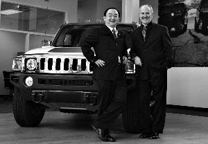 2009年10月8日,在美國密歇根州紹斯菲爾德,悍馬公司首席執(zhí)行官金泰勒(右)和四川騰中重工機械有限公司總經(jīng)理楊毅在一輛悍馬汽車前合影。
