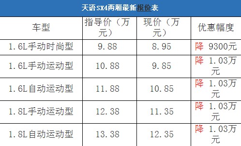 近日,編輯從北京地區(qū)長(zhǎng)安鈴木4S經(jīng)銷(xiāo)商處了解到,天語(yǔ)SX4的1.6L排量車(chē)型現(xiàn)車(chē)充足,顏色也非常齊全,目前購(gòu)車(chē)最高有1.03萬(wàn)元的現(xiàn)金優(yōu)惠,性?xún)r(jià)比很不錯(cuò)。以下是天語(yǔ)SX4最新價(jià)格變化表: