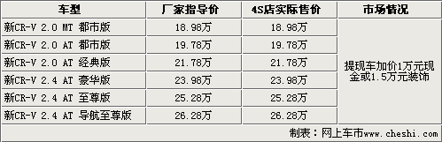東風本田旗下的CR-V車型自上市以來,一直以其較高的性價比占領(lǐng)著國內(nèi)家用SUV市場的半壁江山,提現(xiàn)車的加價銷售從CR-V上市之日起持續(xù)到了現(xiàn)在,CR-V的暢銷為同級別車型樹立了典范。3月5日東風本田正式推出全新的CR-V,在售價不變的情況下對全系車型進行了配置升級,并推出了導航版車型。那么新車上市后的市場行情是什么樣子呢?根據(jù)網(wǎng)上車市價格監(jiān)測系統(tǒng)顯示,全新上市的CR-V依然存在加價售車的現(xiàn)象。具體車型售價見下表: