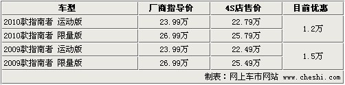 據(jù)4S店銷售人員介紹:指南者目前共有2009款及2010款車型,分別為運(yùn)動(dòng)版及限量版總共4款。09款車型現(xiàn)車顏色為黑色及綠色,全系優(yōu)惠1.5萬元;2010款車型有黑色、綠色、紅色,最高優(yōu)惠1.2萬元。目前老款及新款優(yōu)惠價(jià)格相對較高,如果到店洽談會(huì)有簡單裝飾贈(zèng)送。09款指南者優(yōu)惠后最低僅售22.49萬元,凸顯性價(jià)比。