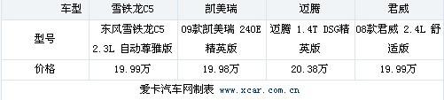 本次選取了4款車中售價約為20萬的4個車型進行橫向數據對比。通過對車身尺寸,動力配置,安全性及舒適性配置的數據對比為您選購愛車進行比較。因為此次我們選擇的是價格區(qū)間非常接近的4款車型,沒有考慮排量和高低配的因素,所以在各項配置方面各車型之間存在一定差距。