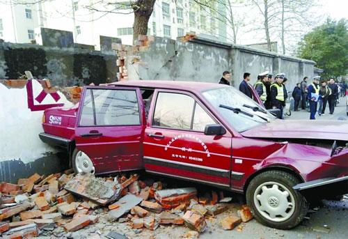 駕校訓(xùn)練場與路面落差有2米多高,這輛教練車接連沖破了圍欄、隔離墩和圍墻。 網(wǎng)友 王梓媽 本報記者 董旭明 攝