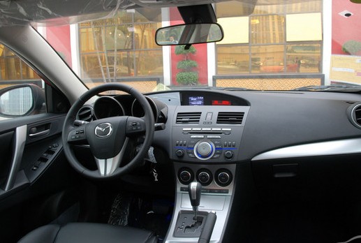 馬自達(dá)3的內(nèi)飾采用了全黑配色,運(yùn)動(dòng)取向立現(xiàn)。中控臺(tái)設(shè)計(jì)甚為特別,自上而下分布的功能區(qū)域其實(shí)處在不同的平面之上,也就是說(shuō),馬自達(dá)3的中控臺(tái)是立體的褶皺面。儀表臺(tái)上,是兩個(gè)碩大的的炮筒狀儀表,至于行車信息顯示則居于中空最上方一弧形內(nèi)。作為一輛進(jìn)口車,馬自達(dá)3用他精致的內(nèi)飾做工告訴我們什么是原裝日本車的質(zhì)感,只有英朗的內(nèi)飾工藝能與之一拼。