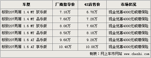標(biāo)致207系列在推出限量版車型后,一直備受消費者關(guān)注。兩廂207在繼承了三廂車型優(yōu)點的同時,又添加了許多運動因素,更適合年輕時尚的消費者。根據(jù)網(wǎng)上車市價格監(jiān)測系統(tǒng)顯示,目前207兩廂可以優(yōu)惠現(xiàn)金4000元,或選擇贈送4項保險及大禮包。具體車型行情如下: