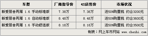 東風(fēng)雪鐵龍愛麗舍從9月份開始,對(duì)車型進(jìn)行了一次全面升級(jí)。2010款新愛麗舍在安全、舒適、節(jié)油和性能方面比老款有增加了相應(yīng)的配置,進(jìn)一步強(qiáng)化了新愛麗舍成熟的產(chǎn)品品質(zhì)。而09款兩廂愛麗舍更具城市便利性,其備箱空間絲毫不亞于三廂車型,是繼富康后的又一經(jīng)典兩廂叫用車。根據(jù)網(wǎng)上車市價(jià)格監(jiān)測(cè)系統(tǒng)顯示,目前購(gòu)買愛麗舍兩廂,可享受購(gòu)置稅減半,折合最高優(yōu)惠約3600元。具體車型價(jià)格行情如下: