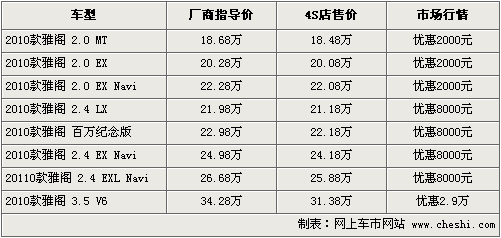 新雅閣一直是日系中級(jí)車型的典型代表,新雅閣憑借其大氣的外觀、舒適的空間和豪華的配置在中級(jí)轎車市場(chǎng)中占據(jù)了一席之地。去年,廣汽本田又對(duì)第8代雅閣進(jìn)行了小改款,對(duì)原來車型的配置有一定程度提升,部分車型增加了智能鑰匙和后遮陽(yáng)板等,提高了雅閣整體車型的性價(jià)比。近日根據(jù)網(wǎng)上車市價(jià)格監(jiān)測(cè)系統(tǒng)顯示,目前雅閣全系最高優(yōu)惠近3萬元,2.4L現(xiàn)車較齊全。具體價(jià)格以及優(yōu)惠幅度如下: