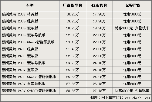 2010款凱美瑞于2010年3月1日在深圳正式上市,售價(jià)相較于09款有所調(diào)整,多款車型價(jià)格進(jìn)行了官方下調(diào)。售價(jià)區(qū)間為18.28-28.38 萬元。根據(jù)網(wǎng)上車市價(jià)格監(jiān)測(cè)系統(tǒng)顯示,目前2010款凱美瑞上市不到一個(gè)月就已經(jīng)開始出現(xiàn)優(yōu)惠,最高降幅達(dá)6000元。具體車型售價(jià)見下表: