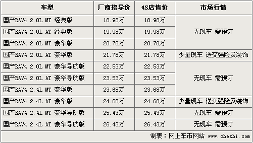 受豐田“召回門(mén)”的影響,RAV4持續(xù)的加價(jià)現(xiàn)象已經(jīng)不復(fù)存在。據(jù)一汽豐田4S店銷(xiāo)售人員介紹,目前豐田RAV4購(gòu)車(chē)可 獲贈(zèng)交強(qiáng)險(xiǎn),并且還贈(zèng)送千元的裝飾禮包,裝飾包括:貼膜、腳墊、坐墊等可供消費(fèi)者選擇。現(xiàn)車(chē)方面不太齊全,2.0L只有豪華版有少量黑色現(xiàn)車(chē),2.4L有 豪華版銀色、黑色等現(xiàn)車(chē)供應(yīng),相比前段時(shí)間現(xiàn)車(chē)供應(yīng)緊張的狀況,目前的供貨慢慢趨于緩解。行情信息多變,請(qǐng)以當(dāng)日行情為準(zhǔn)。