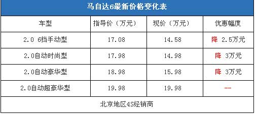 近日,編輯從北京地區(qū)方正利成一汽馬自達(dá)4S經(jīng)銷商處了解到,馬自達(dá)6的現(xiàn)車充足,優(yōu)惠幅度非?捎^,手動(dòng)擋車型降價(jià)2.5萬(wàn)元,而自動(dòng)擋車型最高可以降價(jià)3萬(wàn)元。據(jù)經(jīng)銷商透露,選擇分期付款,那么消費(fèi)者首付不足8萬(wàn)元就可以把曾經(jīng)的“神車”開(kāi)回家。
