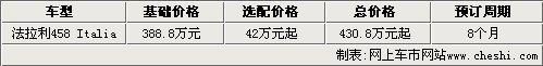 據(jù)法拉利北京展廳銷售人員介紹,目前法拉利458 Italia已經(jīng)有展車抵達展廳,消費者可隨時到店看車。而且法拉利458 Italia已經(jīng)開始接受預(yù)訂,起價為388.8萬元,消費者如果預(yù)定這款新車,至少要選裝42萬元的配置,總價格為430.8萬元起。另外,消費者如果現(xiàn)在下訂單的話,需要在明年1月份才能提到現(xiàn)車。