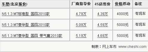 夏利車型在國內(nèi)的銷量一直都處于很平穩(wěn)的高度,超高的性價比成就了夏利車型出色的認可度。天津一汽夏利與去年年底推出了全新夏利N5車型,在夏利其他車型光環(huán)的照耀下,N5同樣交出了一份很出色的答卷。近期,網(wǎng)上車市走訪了天津一汽夏利北京地區(qū)4S店,了解到夏利N5最新的市場信息,具體信息請參考下表: