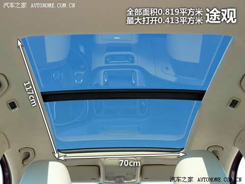 途觀的天窗和大眾以往其他的電動(dòng)天窗秉承一樣的設(shè)計(jì),一鍵式開啟時(shí),天窗并不能一直打開到底,這個(gè)時(shí)候打開的長(zhǎng)度大概為46cm,再擰一下旋鈕,天窗會(huì)繼續(xù)向后打開,此時(shí)打開的長(zhǎng)度為59cm,全部可打開的面積達(dá)到0.413平方米。此外,在打開方式中還有一種換氣模式,跟前面說(shuō)過(guò)的Q5一樣,前天窗會(huì)翹起,形成一個(gè)開口,用來(lái)起到換氣的作用,只是看起來(lái)比較窄而已。