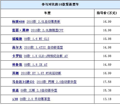 汽車之家的年度大戲又開鑼了!經(jīng)過兩個多月的精心策劃和準(zhǔn)備,我們組織了這次大型的緊湊型車全面對比!我們的目標(biāo)是將市場上主流的緊湊型車一網(wǎng)打盡,來一次從里到外、從靜到動的全面PK。這次一共邀請到了以下十款車型,他們款型相對都比較新,消費者在選車的時候經(jīng)常徘徊其中。從今天開始,我們將分別從外觀與做工、內(nèi)飾與空調(diào)、儲物空間、乘坐空間等四個靜態(tài)方面和動力與操控性能、燃油經(jīng)濟性等兩個動態(tài)方面以及保養(yǎng)售價等對這十款車進(jìn)行全面的對比。