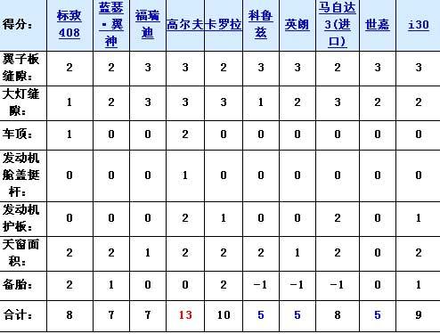 不難看出,標(biāo)致408雖然夠大,但他的做工和細(xì)節(jié)并不像看上去那么精細(xì),在10款緊湊型車中僅僅處于中等水平;藍(lán)瑟·翼神各方面中規(guī)中矩,沒有突出的亮點(diǎn);福瑞迪的外觀縫隙控制最出色,但天窗面積和備胎令人不爽;身材最小的高爾夫6因?yàn)榫哂芯?xì)的外部做工,大面積的天窗和發(fā)動(dòng)機(jī)護(hù)板而在外觀方面有一定的優(yōu)勢,同時(shí)他的外觀也是十分招人待見的,只不過不停的減配令人很不爽;卡羅拉中庸但沒有明顯的短板,所以得分也不低;來自于通用集團(tuán)的科魯茲和英朗存在同樣的問題:大燈縫隙有點(diǎn)大,小備胎令人很很懊惱;進(jìn)口馬自達(dá)3如果不是因?yàn)樾涮サ脑挘敲闯煽円膊诲e(cuò);世嘉除了縫隙控制得還可以以外,其他方面沒有任何亮點(diǎn);i30的表現(xiàn)卻比想象中強(qiáng)大,各方面均衡,成績僅次于卡羅拉。