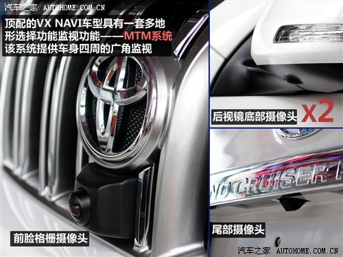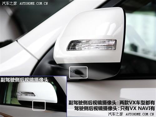 配置上的區(qū)別首先在前臉格柵就能發(fā)現(xiàn),因?yàn)樵谲嚇?biāo)下面隱藏了一個攝像頭,而這在低配車型上是沒有的,與之搭配的是正副駕駛后視鏡下面和車輛尾部也各有一個攝像頭,四個攝像頭組成了VX NAVI車型的“MTM多地形選擇功能監(jiān)視系統(tǒng)”。VX車型則沒有正駕駛后視鏡上的攝像頭。