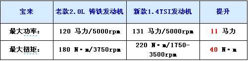 寶來2011款車型終于使用了大眾1.4T+DSG的動(dòng)力組合,1.4TSI發(fā)動(dòng)機(jī)最大功率131馬力,并可以在1750-3500轉(zhuǎn)的區(qū)間輸出220牛米的扭矩。相比那款鑄鐵的2.0L發(fā)動(dòng)機(jī),在最大功率上提高了11馬力,最大扭矩更是增加了40牛米之多。
