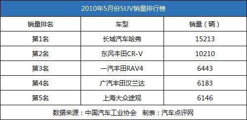 而其中最讓人欣慰的,還是SUV市場(chǎng),5月份共銷售10.31萬輛,環(huán)比下降0.84%,同比增長(zhǎng)1.1倍。我們不妨來看看銷量榜上的SUV前五名,他們占據(jù)了SUV總銷量的43%,可以說購買SUV的近一半消費(fèi)者都選擇的是這5款車。