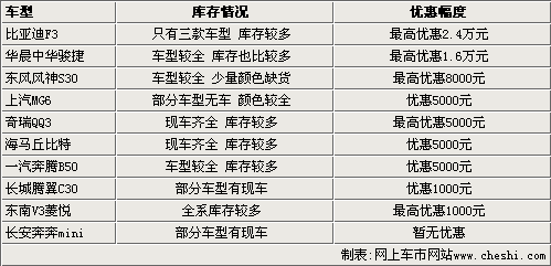 我們這次選擇了10款市場(chǎng)上銷(xiāo)售火爆的自主品牌車(chē)型,比如比亞迪F3、駿捷、奇瑞QQ3等車(chē)型。通過(guò)對(duì)北京市場(chǎng)的調(diào)查發(fā)現(xiàn),東南V3菱悅CVT、騰翼C30等新車(chē)型上市后,現(xiàn)車(chē)都能很快進(jìn)入終端市場(chǎng),而且出現(xiàn)了一定的優(yōu)惠幅度。而比亞迪F3、駿捷等熱銷(xiāo)車(chē)型,也隨著新老產(chǎn)品的更新?lián)Q代,庫(kù)存壓力變大,從而使優(yōu)惠幅度也變的更多。