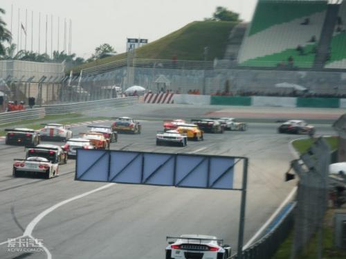 GT300、GT500兩組賽車同時(shí)發(fā)車,1號彎競爭非常激烈↑