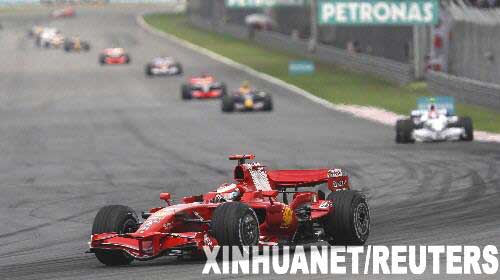 3月23日,法拉利車隊(duì)車手萊科寧(前)駕駛賽車角逐。當(dāng)日,在F1大獎(jiǎng)賽馬來西亞站的比賽中,萊科寧以1小時(shí)31分18秒555的成績奪得冠軍。