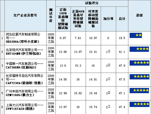 獲得五星級碰撞成績的車型還有:長安福特馬自達汽車有限公司生產(chǎn)的蒙迪歐牌CAF7230A型轎車(蒙迪歐致勝)、廣州豐田汽車有限公司生產(chǎn)的豐田牌TOYOTA GTM7160G型轎車(豐田雅力士)、上海大眾汽車有限公司生產(chǎn)的朗逸牌LAVIDA SVW7167ASD型轎車。北京現(xiàn)代汽車有限公司生產(chǎn)的北京現(xiàn)代牌BH7164MW型轎車(悅動)獲得四星級成績。河北紅星汽車制造有限公司生產(chǎn)的紅星牌HX6300A型旅行車(雙環(huán)小貴族)僅獲兩星級成績。
