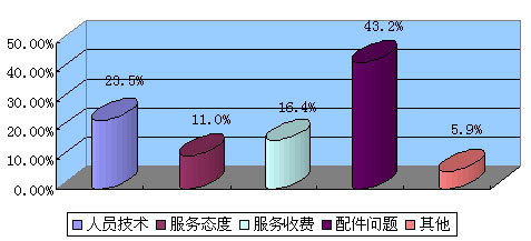 報告顯示,在汽車產(chǎn)品服務(wù)質(zhì)量的投訴中,對配件問題、服務(wù)態(tài)度的投訴較上一季度有所增加,對人員技術(shù)、服務(wù)收費(fèi)的投訴有所下降。其中,久修不好是引發(fā)消費(fèi)者投訴廠家服務(wù)質(zhì)量的最主要原因。具體構(gòu)成比例:人員技術(shù)占23.5%,服務(wù)態(tài)度占11.0%,服務(wù)收費(fèi)占16.4%,配件問題占43.2%,其他占5.9%。