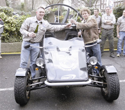 風扇汽車既可以在崎嶇不平的沙地飛馳,又能像飛機一樣在空中飛行。在降落傘和一個巨型風扇發(fā)動機的幫助下,探險家們計劃先在安道爾附近的比利牛斯山脈上空飛行,穿越14公里長的直布羅陀海峽,接下來,將飛越摩洛哥阿特拉斯山脈和撒哈拉沙漠,哪里沒有了公路,他就從哪里發(fā)動風扇發(fā)動機駕車升空。