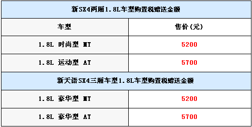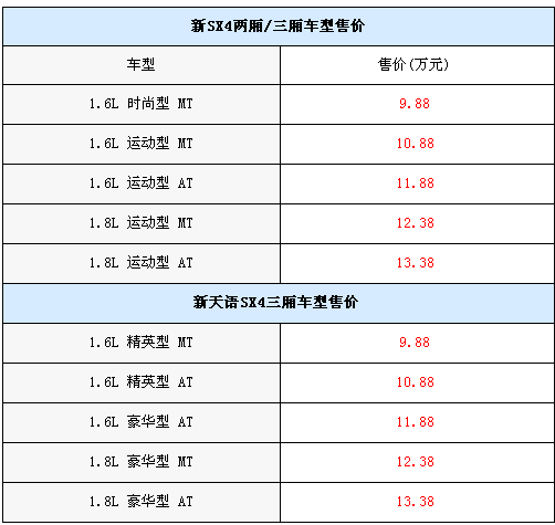 2009年3月10日,長安鈴木新款SX4車型上市。此次上市的新車共有1.6L和1.8L兩個排量,其中1.8L為新增車型。新款SX4兩廂/三廂車型各推出5款車型,共計10款,售價區(qū)間為9.88~13.38萬元。同時,長安鈴木宣布,購買新增天語SX4 1.8L車型將獲贈50%的購置稅補貼,享受與 1.6L車型同等的購置稅優(yōu)惠,讓購車者得到更多的實惠。具體車型售價如下: