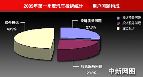 2009年一季度共收到用戶投訴1856例,其中有效投訴為1742例,與去年同期相比,增加了17.8%。一季度汽車產(chǎn)品的投訴量和投訴解決率相比上季度有了較大提高。涉及企業(yè)包括一汽大眾、上海大眾、 東風(fēng)雪鐵龍、上汽通用五菱、上海通用、長安福特、上海汽車、廣州本田、天津一汽、廣州豐田、吉利汽車、奇瑞汽車等幾十家國內(nèi)汽車生產(chǎn)企業(yè)。