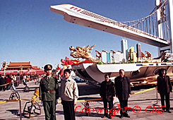 北京天安門廣場(chǎng)十月二日布置了數(shù)十輛參加五十周年國(guó)慶群眾游行的各省、區(qū)彩車,代替花壇供市民觀光,從清晨開始就許多游客在花車前留影。