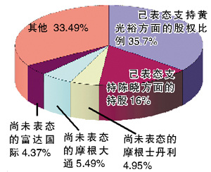 從公開表態(tài)的情況來看,黃光裕陣營除了自己的32.47%股權(quán)外,還有黃光裕好友鄭建明2%、表明“挺黃”的內(nèi)地股民歐陽雪初方面0.6%的股權(quán)支持,合計(jì)持股大概是35.7%。