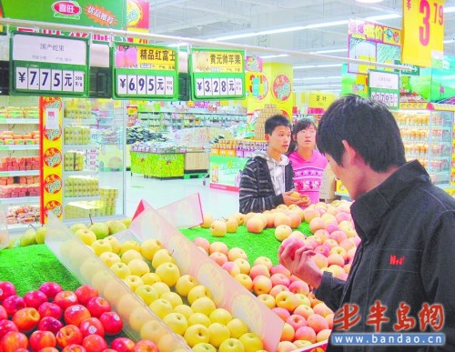 26日上午,記者走訪了家樂福、佳世客、大潤發(fā)等超市,發(fā)現(xiàn)質(zhì)量比較好的紅富士定價(jià)全都在七元左右!斑@哪是蘋果旺季啊,價(jià)格比淡季賣得都高!辈簧兕櫩统虺蚣t彤彤、新鮮香甜的大蘋果,再看看“價(jià)格不菲”的標(biāo)價(jià)牌,望而卻步。