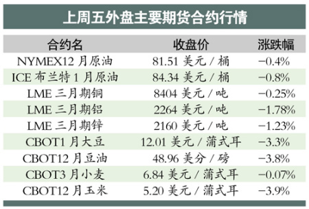 紐約商業(yè)期貨交易所(NYMEX)的原油期貨略跌0.4%,收?qǐng)?bào)81.51美元/桶;倫敦金屬交易所(LME)的有色金屬也大多收跌,但銅、鋁、鋅三個(gè)品種的跌幅都在2%以內(nèi)。