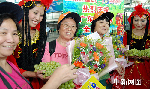 中新網(wǎng)廣州7月31日電 (莫非 林月明)在廣州白云機(jī)場出發(fā)廳,身著漂亮維族服飾的姑娘熱情地將繽紛美麗的鮮花送給游客,盛情邀約廣東游客赴美麗的新疆旅游。這是自“7·5”事件后,廣東首批赴新疆旅游的游客上航班前經(jīng)歷的一幕,意味著暫時(shí)停滯了近一個(gè)月的廣東新疆游市場,終于全面恢復(fù)正常。