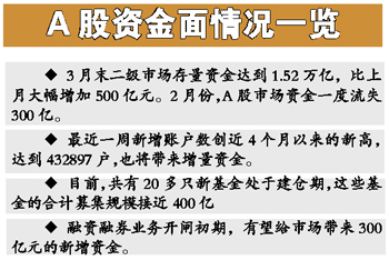 由上海證券報和申銀萬國研究所聯(lián)合推出的股市月度資金報告顯示,今年3月末,A股市場的存量資金在經(jīng)歷了近3個月的盤底振蕩后開始上升,當月末二級市場存量資金達到1.52萬億,比上月大幅增加500億元。這個跡象,使得二月份一度明顯流失的市場資金面再度回穩(wěn),此前的2月份,A股市場資金一度流失300億。