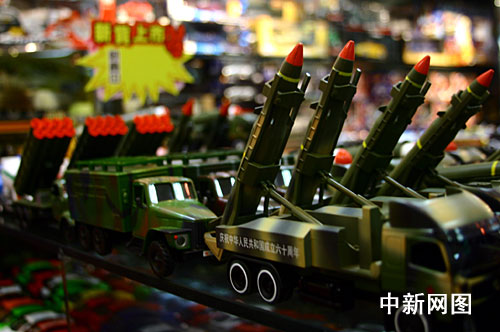 而在國際商貿(mào)城二期的旅游購物中心一家玩具商鋪,“移動加榴炮發(fā)射車”、“洲際導彈發(fā)射車”、“后勤保障車”等曾在閱兵式上“亮相”的軍事武器玩具模型,一個方陣一個方陣地排列著,接受著市場的“大閱兵”。