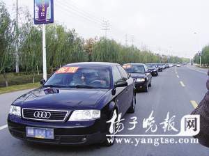 記者在現(xiàn)場看到,這支由28輛名車組成的豪華車隊,包括3輛寶馬、11輛奧迪、6輛豐田,以及別克、本田、帕薩特等高檔轎車。約9時10分左右,這支豪華車隊開始緩緩開動起來,最前面由一輛別克轎車“開道”,緊跟在后面的是一輛奔馳面包,車中坐著的就是當日車隊接送的“主角”——張良憲花費160萬元從外地買來的藏獒。這輛奔馳面包車前扎著大紅的綢花,車的側(cè)面掛著一條紅色條幅“中國名獒160萬元落戶宿遷張良憲藏獒繁育基地”。后面的車綿延跟進,每輛車都打著雙跳,緩緩前進,速度在20碼左右。