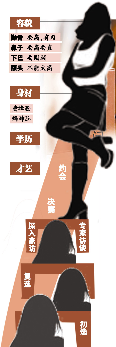 除了形象和心理測(cè)試,美女們還得過“面相關(guān)”。記者在現(xiàn)場(chǎng)看到,美女們經(jīng)過一關(guān)又一關(guān)甄選后,會(huì)來到“面相顧問”的房間,接受“來自香港的相學(xué)專家”的評(píng)判!帮E骨要高,有肉;鼻子要高要直;下巴要圓潤(rùn);額頭不能太高。旺夫相大體就這個(gè)標(biāo)準(zhǔn)。”這位“相學(xué)專家”表示,如果各方面條件都優(yōu)秀,但面相不符合要求,也會(huì)被淘汰出局。