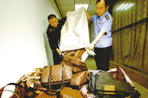 “都有些什么東西?”“隨便看嘛,皮包、皮帶,全是名牌喲……”1日晚7點多,設(shè)在渝中區(qū)某高檔寫字樓的一“專賣店”迎來了兩名特殊客人。“專賣店”門口擺著近3平方米的大招牌,寫著“LV重慶店”等內(nèi)容。兩名客人進店后不到一分鐘,突然涌進10余名身著工商制服的執(zhí)法人員。