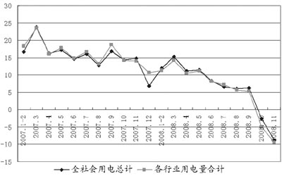 由國網(wǎng)北京經(jīng)濟(jì)技術(shù)研究院副院長胡兆光博士繪制的一份“2007年以來各月我國全國及各行業(yè)用電量增長速度”圖表(圖1)顯示:全國月度用電量增長率在2007年3月曾高達(dá)23.88%,全行業(yè)(一、二、三產(chǎn))月度用電量增長率也達(dá)到23.48%。此后便呈起伏式下滑,全國用電量10月份同比增長-2.18%,11月份同比增長-8.33%。