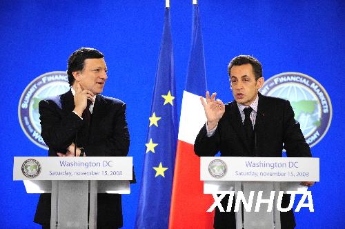 11月15日,在美國首都華盛頓出席二十國集團領(lǐng)導(dǎo)人金融市場和世界經(jīng)濟峰會的法國總統(tǒng)薩科齊(右)和歐盟委員會主席巴羅佐聯(lián)合舉行新聞發(fā)布會。 新華社記者張巖攝