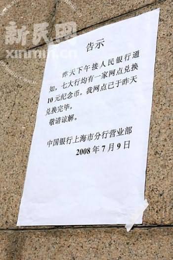 據(jù)悉,在昨天部分銀行網(wǎng)點(diǎn)開(kāi)放兌換奧運(yùn)紀(jì)念鈔后,今天是滬上各大銀行集中兌換的日子。市民都是得知這一消息后趕來(lái)的,其中更有人在昨晚看了新聞后便趕到銀行門口候了一晚。但今天上午7點(diǎn)多,銀行工作人員忽然在門口貼出告示,表示該支行的配額已經(jīng)在之前兌換完畢,讓排隊(duì)市民去別家支行兌換。
