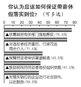 民調(diào)顯示,對于保證帶薪休假落實到位,76.6%的公眾認(rèn)為要依靠政府有關(guān)部門強制督促,大力推行;71.4%的人認(rèn)為要對違反者經(jīng)濟重罰,行政司法同步介入。接下來,公眾給出的排序是:保障勞動者申訴渠道暢通(43.5%);鼓勵民間的勞動者維權(quán)組織發(fā)展(41.2%);對落實到位的企業(yè)進行社會宣傳,以此鼓勵(39.3%)。(實習(xí)生 汪東亞)